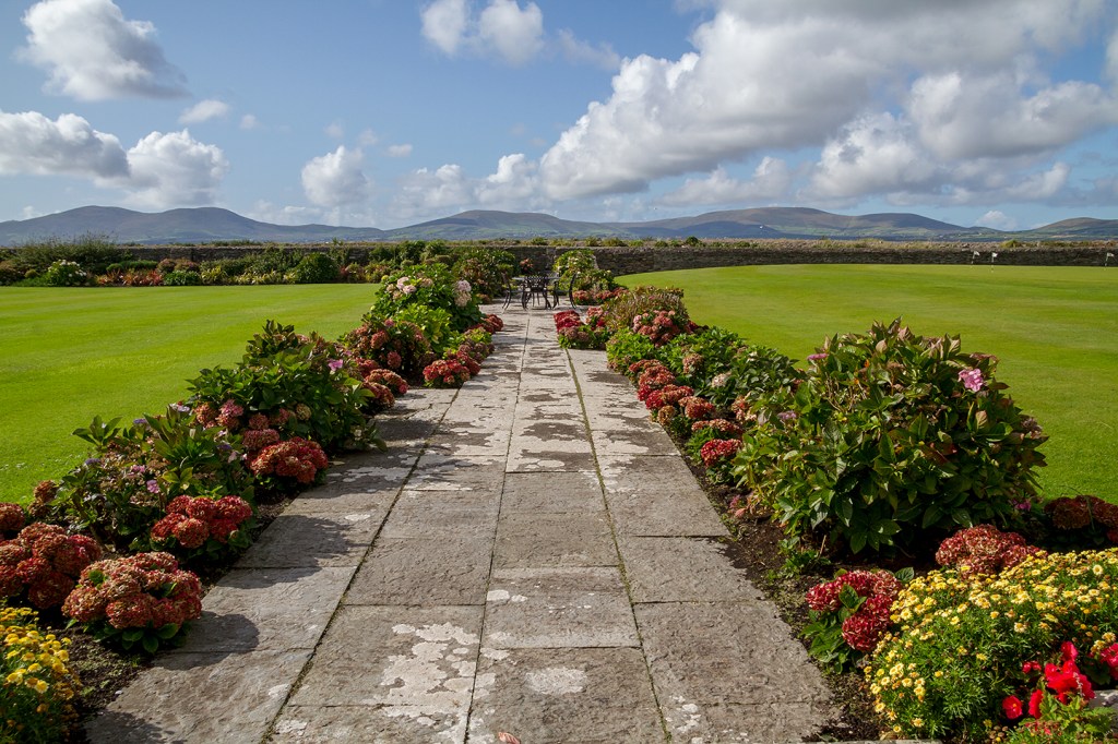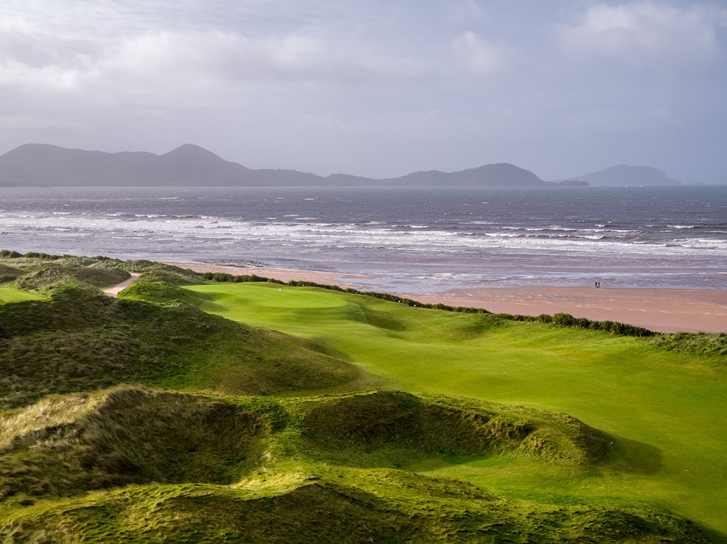 We returned this past September to “An Coireán”, or Waterville, as it is known today. The town is situated on a narrow isthmus with the wild Atlantic on one side and Lough (Lake) Currane on the other. The crescent shaped Ballinskelligs Bay serves as a backdrop for two great golf courses: Waterville Golf Links, whose history traces back to 1889, is located at the top of the crescent and Hogs Head Golf Club, built about two years ago, can be found at the crescent’s southern tip. Evan was scheduled to shoot both courses. We thought with nine days on the ground, and a bit of Irish luck, the sun would shine enough for Evan to get the shots he needed. It was not to be. We had only one good morning and afternoon and then a few brief moments around sunset. It was a waiting game, but we were fortunate to be able to wait it out at the magnificent Waterville House owned, in conjunction with Waterville Golf Links, by the same Irish-American investor group since 1987.